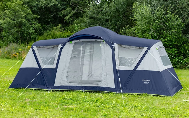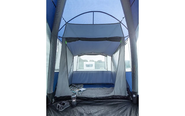 Aufblasbares, komfortables Familienzelt aus hochwertigem Ripstop-Polyester mit viel Platz für bis zu 4 Personen. Schneller und unkomplizierter Aufbau Dank aufblasbarem Gestänge. Sechs Fenster (je ½ Moskitogaze, ½ Klarsichtfolie) sorgen für die perfekte Wohlfühlatmosphäre mit ausreichend Lichtzufuhr und Ventilation. Der fest eingenähte Zeltboden bietet zusätzlichen Komfort und schützt vor Schmutz, Nässe wie auch ungebetenen Tieren. Zudem überzeugt das Zelt mit zwei einhängbaren Schlafkabinen inklusive Moskitogaze-Tür, welche bei Bedarf zur Vergrößerung des Wohnraums entfernt werden können. Der geräumige Aufenthaltsraum lädt zum Verweilen ein und bietet aureichend Platz für Ihr Mobiliar.