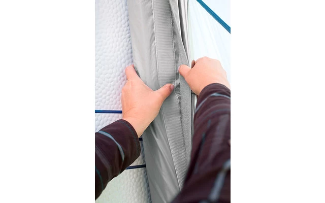 Der Schaumstoffwulst wird mit Klettverschluss an der Seitenwand befestigt und stabilisiert die Wand in Verbindung mit der Spezial-Andruckstange am Caravan, Kastenwagen oder Reisemobil gegen Wind.