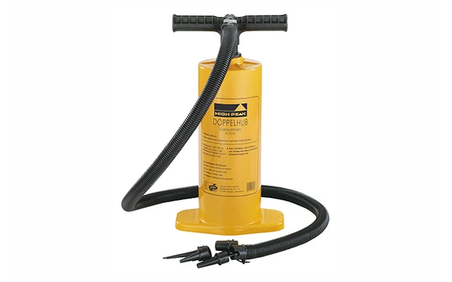 Die High Peak Doppelhubpumpe hat einen fortdauernden Luftstrom bei Zug- und Druckbewegung und eignet sich ideal zum Aufblasen und Entlüften großer Aufblasartikel. Die Pumpe hat Bajonett-Verschlüsse, 4 Adapter und einen langen, nicht knickenden Schlauch. Die Pumpe mit einem Volumen von 2x 2.000 cm³ wiegt nur ca. 900 g.