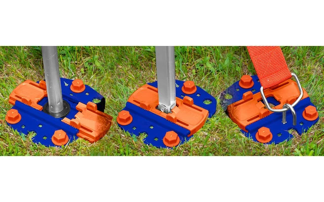 Passend für Markisen, Zeltstangen oder Sturmgurte jeglicher Art. Markisenfüße oder Zeltgestänge sind sicher zwischen den Platten fixiert und können nicht im weichen Boden versinken oder abheben. Höhenverstellbarer Haken fixiert die Platte. Einfaches Öffnen des Schiebers.