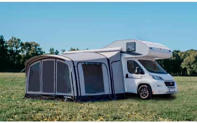 Das extra hohe Vorzelt NEPTUNE ist ein speziell für Wohnmobile entwickeltes Luftvorzelt. Durch die vier verschiedenen Schleusen, die mit NEPTUNE kombiniert werden können, variiert die Anschlusshöhe von 240~320cm. Das Besondere an diesem Luftvorzelt ist der extra hohe Dachverlauf, der es ermöglicht, die Fahrzeugtür ohne Probleme zu öffnen. Das NEPTUNE ist mit großen Panoramafenstern, einer Tür in der Vorderwand, die bei Bedarf entnommen werden kann und zwei Seitenwänden mit Moskitonetz ausgestattet. Die Seitenteile können